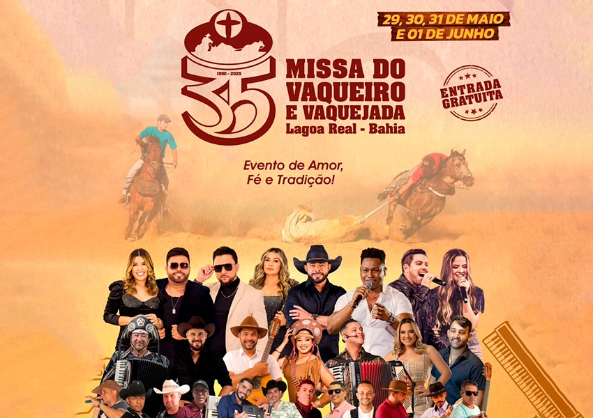 A cidade de Lagoa Real, no sudoeste da Bahia, realiza entre os dias 29 de maio e 1º de junho a 35ª edição da Missa do Vaqueiro e Vaquejada, tradicional celebração que reúne fé, cultura e música sertaneja no Parque do Vaqueiro. O evento, que tem entrada gratuita, promete movimentar a região com shows, desfile de vaqueiros e cerimônia religiosa. A programação musical começa na sexta-feira (30), com apresentações de Rom Novais e Gabriel, Laço de Vaqueiro, Maria Cecília e Rodolfo, Mazinho dos Teclados, Arreio de Ouro, Dio do Acordeon e Júnior Santos. No sábado (31), sobem ao palco Rauane Dourado, Kaio Viola, Kiko Cigano, Junior Marques, Malla 100 Alça, Lorim Vaqueiro e Naldo Duca. O domingo (1º) será animado por Batista dos Teclados, Gabxote, Day Mello, Cristiano e Robério e Forró Xamego de Luxo. O ponto alto da festa é a Missa do Vaqueiro, celebrada no domingo (1º), com recepção aos vaqueiros encourados, desfile pelas ruas da cidade e bênção dos chapéus e animais. O evento também conta com apresentações de repentistas e exposição de objetos típicos da cultura sertaneja. A Missa do Vaqueiro de Lagoa Real é reconhecida como a principal festa do município e conta com apoio do Ministério do Turismo, Sesc, Câmara Municipal, Prefeitura de Lagoa Real e parceiros locais.